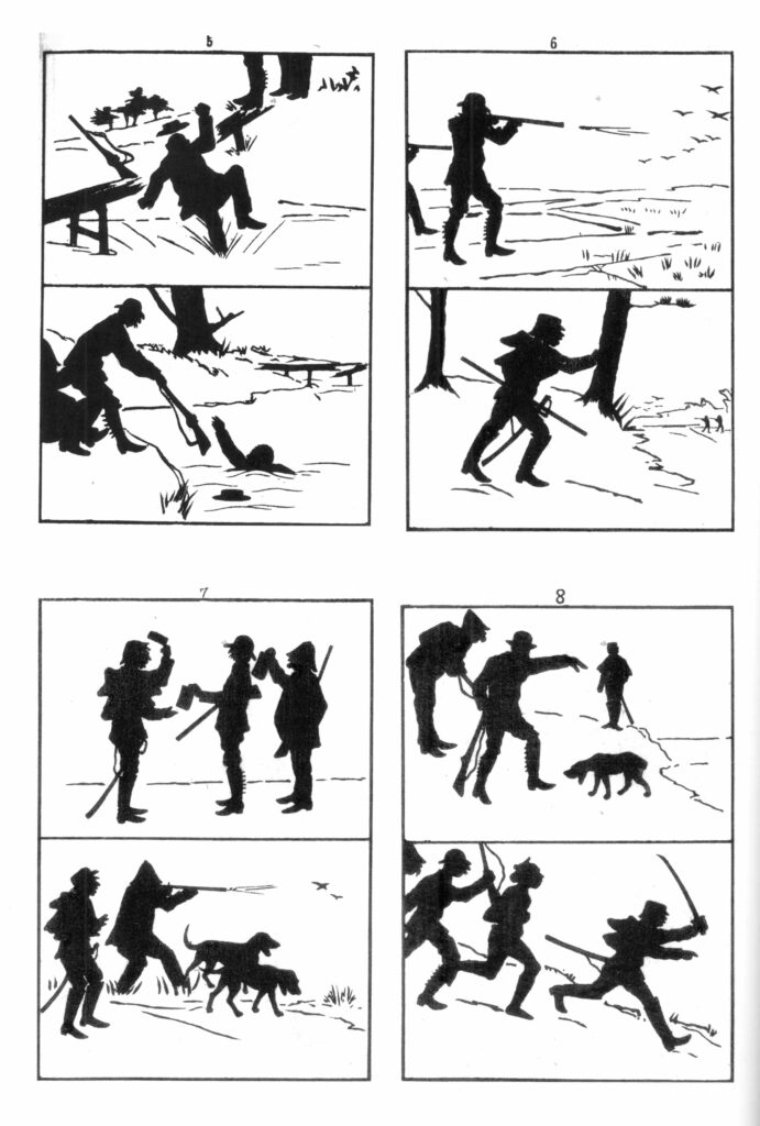 C’est en lisant la monographie que lui ont consacré Christian Polak et Hugh Cortazzi (Georges Bigot and Japan, 1882-1899. Satirist, Illustrator and Artiste Extraordinaire, Folkestone, Renaissance Books, 2018) que j’ai découvert que plusieurs des recueils de dessins qu’il publia également dans l’archipel contenaient des histoires muettes en ombres chinoises, qu’il désignait comme des « histoires en silhouettes ». Les auteurs en reproduisent deux : « Dîner japonais » paru dans l’album Asa (1883) et « Une chasse », tiré de O-Ha-Yo (« Bonjour », 1883). Des histoires où l’on trouve peu de traces d’humour, et qui ressortissent plutôt au récit documentaire. Le traitement en silhouette a pour effet d’anonymiser les personnes représentées et, dans un décor réduit à l’essentiel, de rendre leurs actions parfaitement lisibles. Faute d’une connaissance plus exhaustive des périodiques illustrés publiés au Japon à la fin du XIXe, je ne peux affirmer que Bigot y a introduit l’histoire sans paroles et le dessin d’ombres, mais c’est une hypothèse qui mériterait d’être creusée.