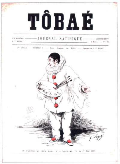 Je veux parler de Georges Bigot (1860-1927). Certes, je lui consacre une quinzaine de lignes (page 183) et reproduis une de ses planches parues dans La Semaine de Suzette, mais c’est une planche qui ne relève d’aucune des deux catégories susmentionnées. En fait, je n’avais pris en considération que la partie française de sa carrière, postérieure à son retour du Japon, où il séjourna de 1882 à 1899. Bigot y avait fondé successivement quatre revues satiriques : Tôbaé (1887-1889, 69 n°s), La Vie japonaise en 1890, Potins de Tokyo (1890) et enfin Le Potin (1893).