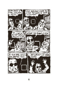 L’effort demandé au lecteur, de déchiffrer chaque image, chaque bulle à la loupe, sans laquelle elles sont illisibles, n’est rien comparé à celui qui a dû être celui de l’auteur, quand on sait qu’il a réalisé la prouesse de travailler au format de publication (avec une loupe plus forte, on l’imagine), ce qui explique le trait un peu tremblé et le lettrage plus approximatif que ceux auquel Mathieu nous avait habitués.