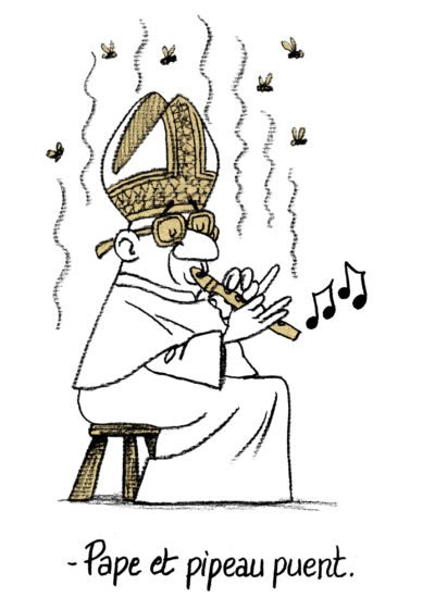 Le titre de l’ouvrage de Lécroart Oulipo par la bande – dont j’extrais le facétieux « Pape et pipeau puent » – peut intriguer : il semble paraphraser Oubapo. C’est qu’Étienne appartient aux deux ; il est le seul dessinateur, à ce jour, qui ait été coopté par les membres de l’Oulipo, qui était jusque-là un cénacle d’écrivains. Il prend, depuis 2012, une part des plus actives aux travaux de la « maison mère », et c’est bien dans ce contexte plus stimulant que sont nés les exercices rassemblés dans le livre en question.
