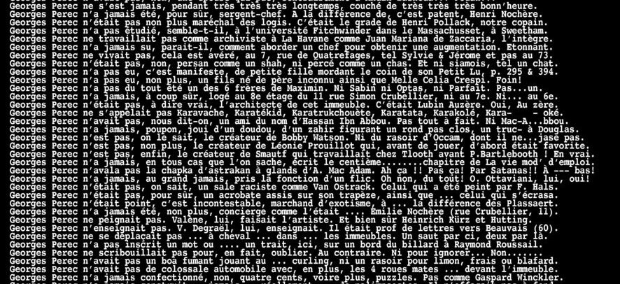 Son « Portrait en creux de Georges Perec » est bien connu. Il consiste en une page de texte décrivant l’écrivain et dessinant son portrait par les blancs du texte, entre les mots et en fin de lignes.