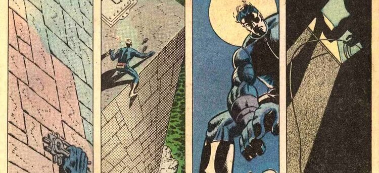 Le silence est loin d’être le seul élément commun aux deux pages. Dans l’une et l’autre, un homme gravit, de nuit, au moyen d’un filin, la façade d’un immeuble. Les cases sont étirées verticalement. On retrouve des effets de plongée et de contre-plongée. La lune est pleine et éclaire la scène. L’ombre qui mange le visage de Rorschach dans la case 4 qui ne rappelle le bandeau noir occultant l’œil gauche de Nick Fury. Et même s’il ne s’agit pas d’une arme, l’engin qu’on lui voit empoigner dans la case 6 présente quelque similitude avec le matériel de combat du vigile en vert et jaune dessiné par Steranko.