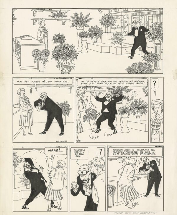 Une tension habite le dessin de Van Den Boogaard : assimilé, à juste titre, à l’école de la ligne claire, il use d’un trait toujours égal, d’une rare précision dans le tracé, et aime dessiner des perspectives, des architectures, des lignes « au cordeau ». Mais à cette épure s’oppose dialectiquement une propension à l’accumulation et au grouillement. Pour me limiter à quelques exemples qui étaient visibles dans l’exposition chez Champaka, elle se remarquait notamment dans la prolifération des cadrans sur le tableau de bord du petit avion aux commandes duquel Léon s’installe dans l’épisode « Léon s’envoie en l’air » ; dans les boiseries, les carreaux de fenêtres, les lignes de tuiles, les détails ornementaux du buffet, dans « Léon se pose des questions » ; dans les compositions florales auxquelles ne manque pas un pétale (« Pootverblomme »), ou encore les couvertures des magazines alignés sur les rayonnages du libraire (Léon-la-Terreur casse la baraque »). Autant de zones de l’image saturées de détails, telles que l’on n’en trouverait pas chez Hergé.