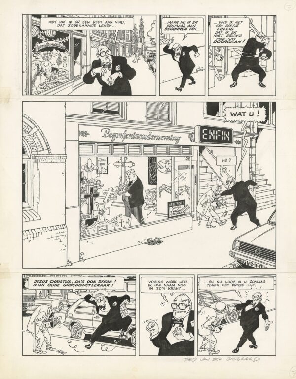 Alors que vient de s’achever, à Bruxelles, une exposition de ses planches originales à la galerie Champaka, j’aimerais revenir ici sur le dessinateur néerlandais Théo Van Den Boogaard (né en 1948) et sur le personnage qui l’a fait connaître en France, Léon-la-Terreur (Sjef van Oekel dans la version originale). Personnage – sans doute un peu oublié aujourd’hui – qu’il anima de 1976 à 1999, sur des scénarios de Wim T. Schippers (lui-même signa les premières pages du nom de Théo Bogart) et qui fut un hôte régulier de L’Écho des savanes dans les années 1980. Une quasi-intégrale a paru chez Drugstore en 2009. Cette réédition mise à part, nous n’avons plus entendu parler de cet artiste depuis le début de notre siècle ; il a délaissé la bande dessinée pour limiter ses activités aux champs de l’illustration et de la publicité, dans son pays.